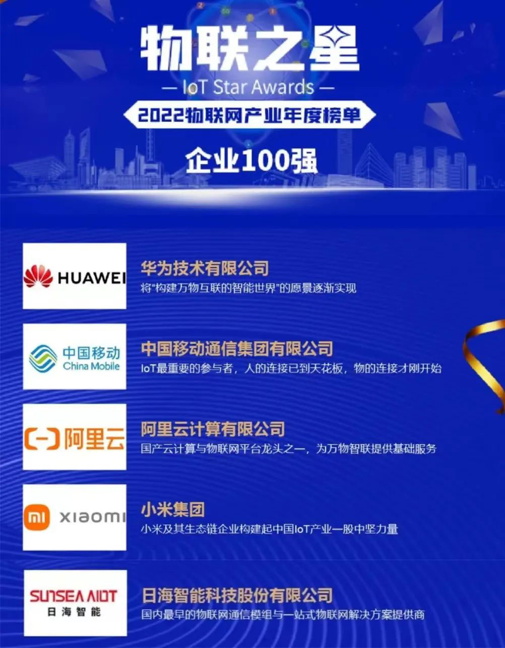 该年度榜单以公司业绩规模与人员规模较大且稳定、近三年业绩规模与净增长率表现良好、研发投入金额与占比较大并有行业影响力的新品发布、同时在物联网领域行业地位突出为四个评选标准进行严格、客观评选。飞速发展的物联网行业群雄并起,优秀企业不断涌现,xingkong星空公司智能脱颖而出,与华为、中国移动、阿里云计算等知名企业齐头并进、共同成为中国物联网企业百强,背后是近三十年的实力积淀。